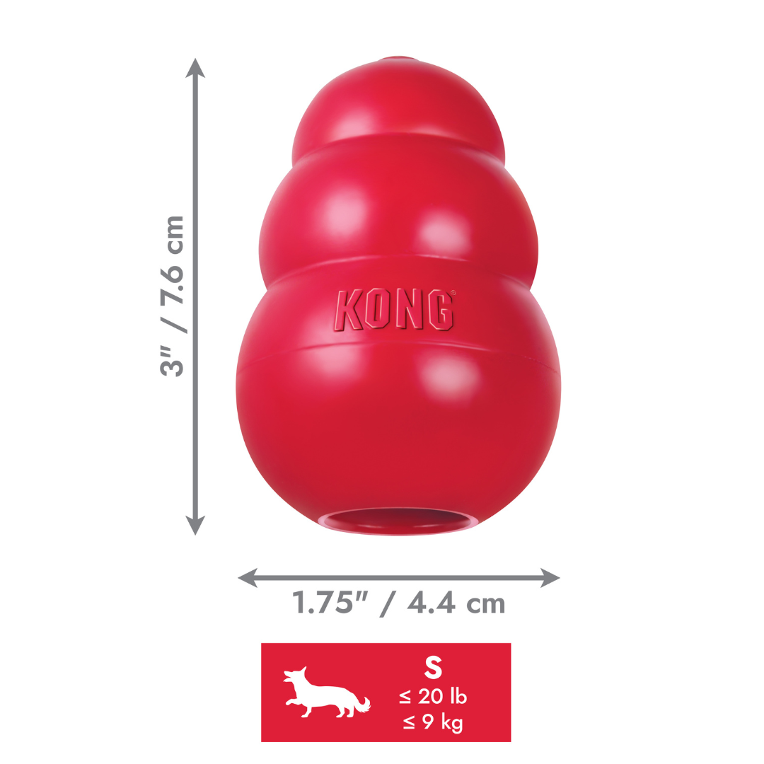 De KONG Classic is de standaard voor hondenspeelgoed en is al meer dan veertig jaar het speelgoed voor honden over de hele wereld. De unieke natuurlijke rode rubberformule van de KONG Classic is ultra-duurzaam met een grillige veerkracht die ideaal is voor honden die graag kauwen en ook voldoen aan de behoefte van een hond om te spelen.